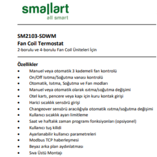 Bu termostatlar, oda sensörleri veya harici sıcaklık sensörlerinden alınan sıcaklık verilerine göre fan coil ünitelerinin hassas bir ÅŸekilde düzenlenmesini saÄŸlar.